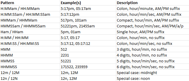 This table shows a summary of the allowed time patterns and examples: